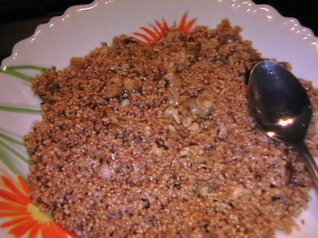 برنج برشته -دوشاب -زیره سیاه -مغز گردوی خرد شده؛محتویات درون بشقاب است.